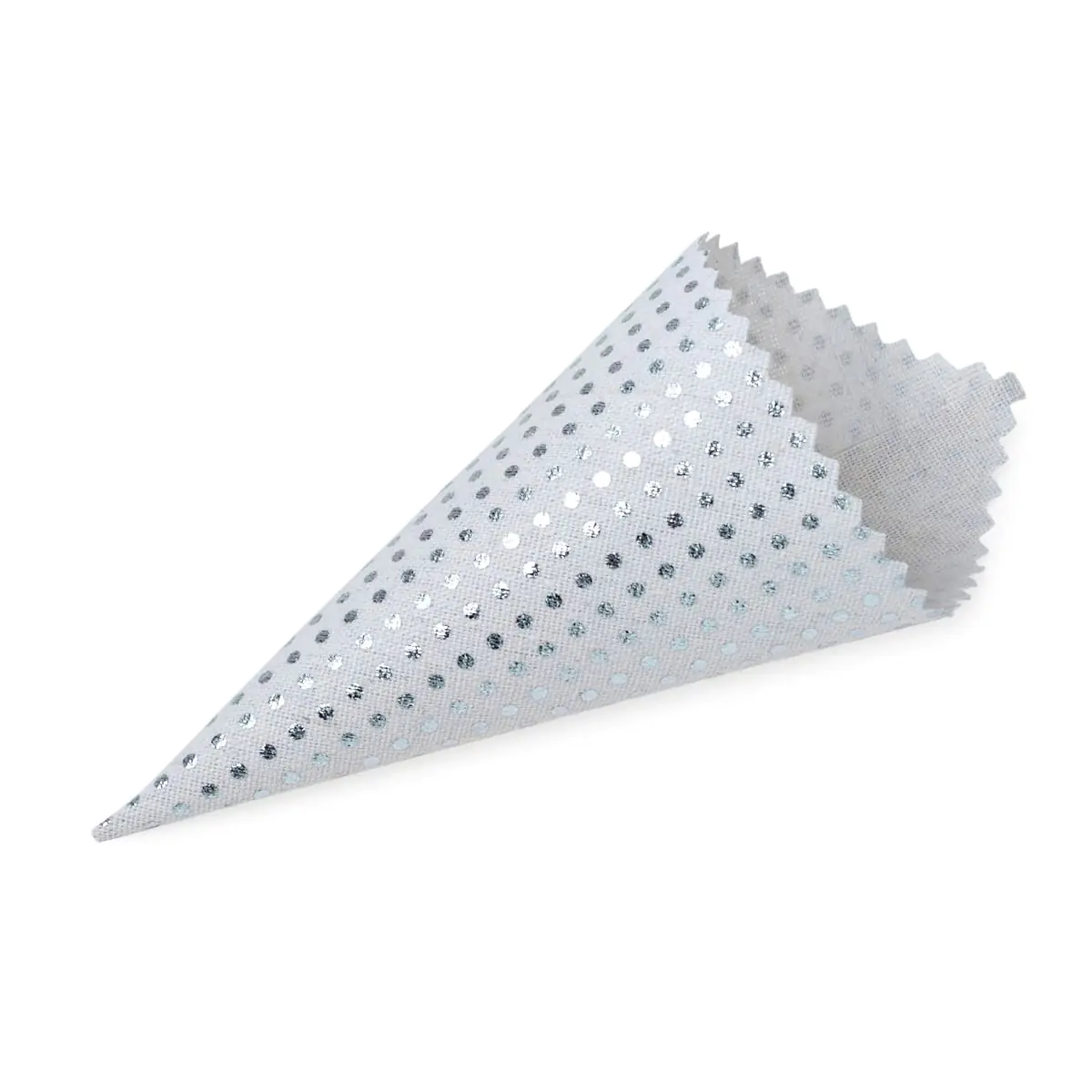Conjunto de 12 Cones para pétalas ou arroz com padrão de bolinhas prateadas ou douradas.