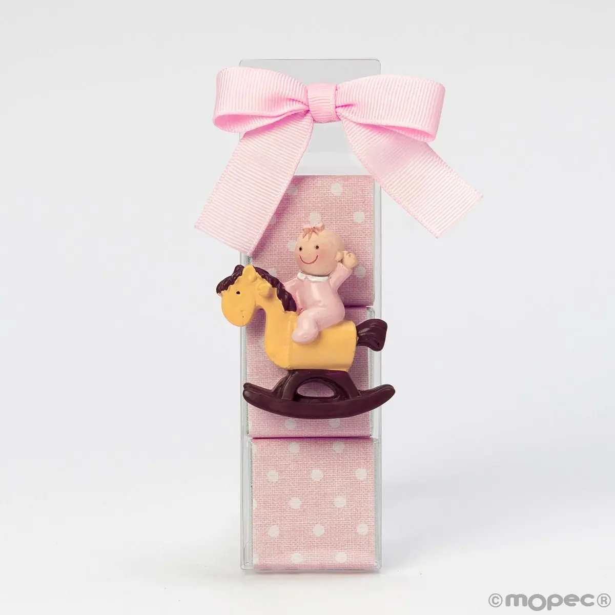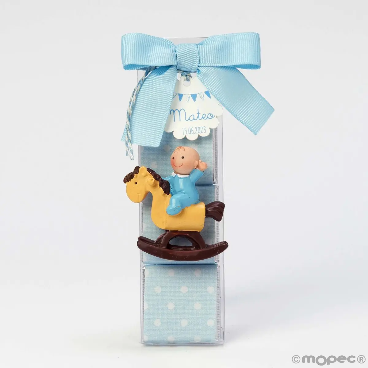 Caixa com três napolitanos em bolinhas rosa ou azul decoradas com o Iman dos simpáticos Pita & Pita montados num cavalo de balanço. Doce detalhe para os convidados.