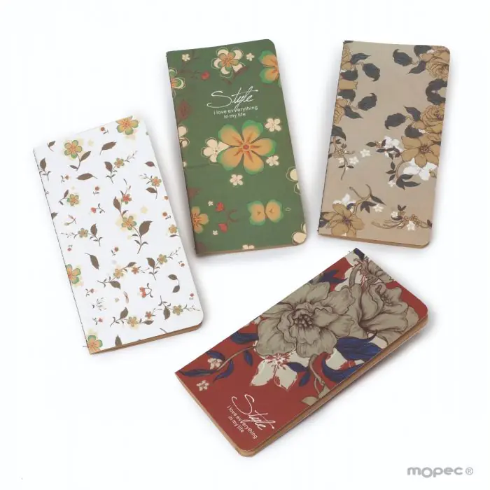 Nossos cadernos de detalhes do casamento são apresentados com um desenho de flores e vêm em quatro modelos: Com fundo branco, verde, bege e ocre, com a lombada costurada.
