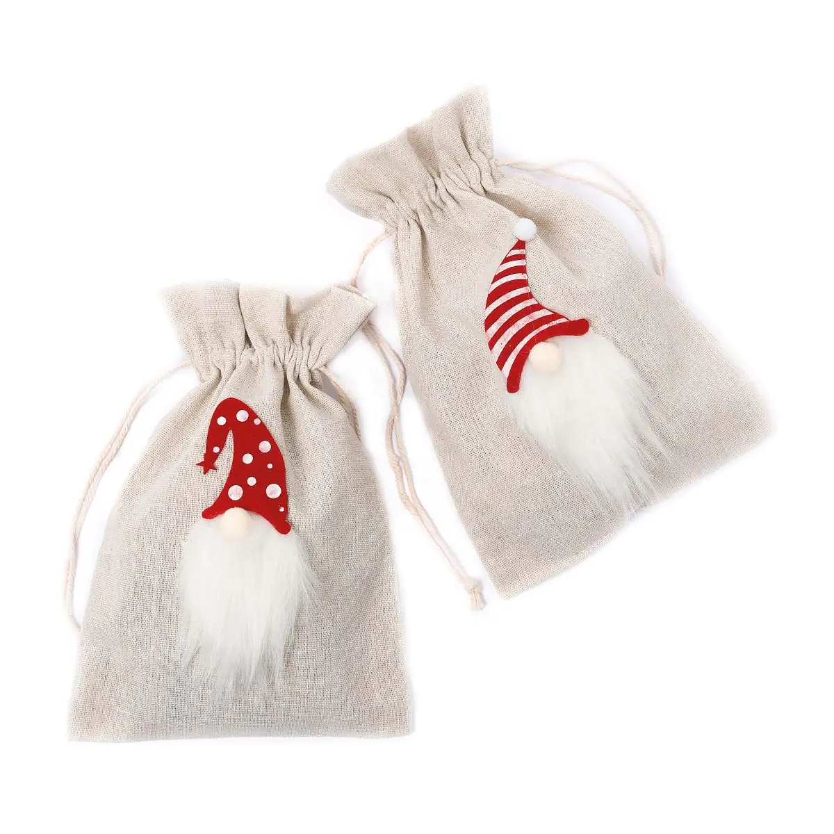 Lindas bolsas bege com gnomos vermelhos sortidas em 2 modelos, o que as torna perfeitas para guardar doces ou produtos de Natal no seu interior.