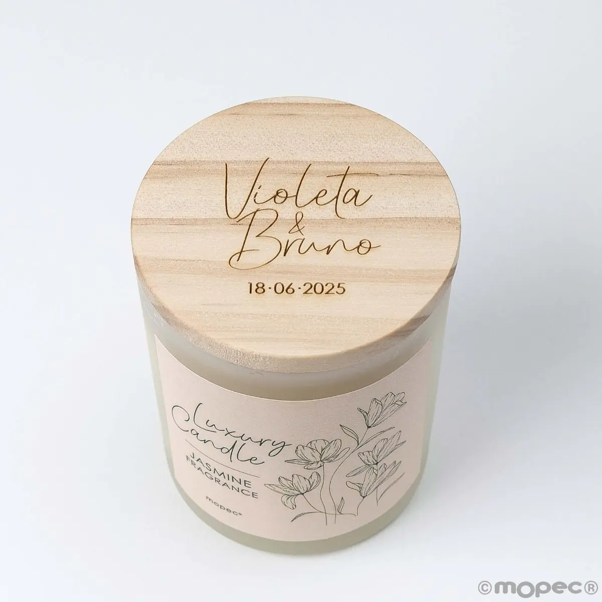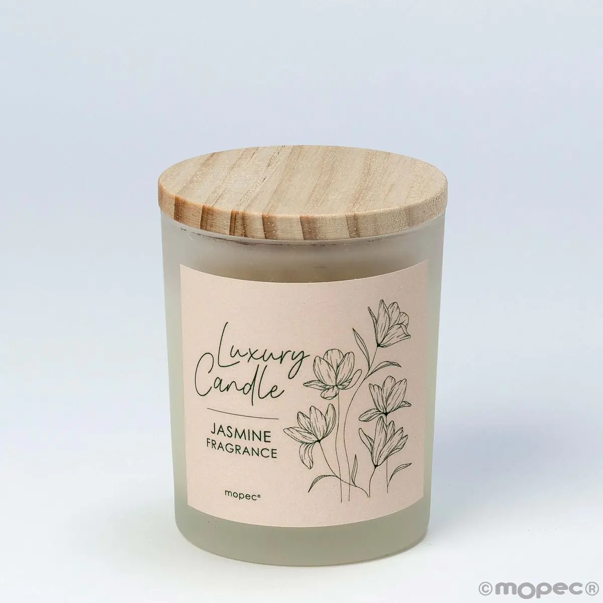 Conjunto de 4 elegantes velas de cera vegetal com aroma de jasmim, graças à sua apresentação em frasco de vidro opaco e tampa de madeira que lhe confere um toque romântico e delicado.