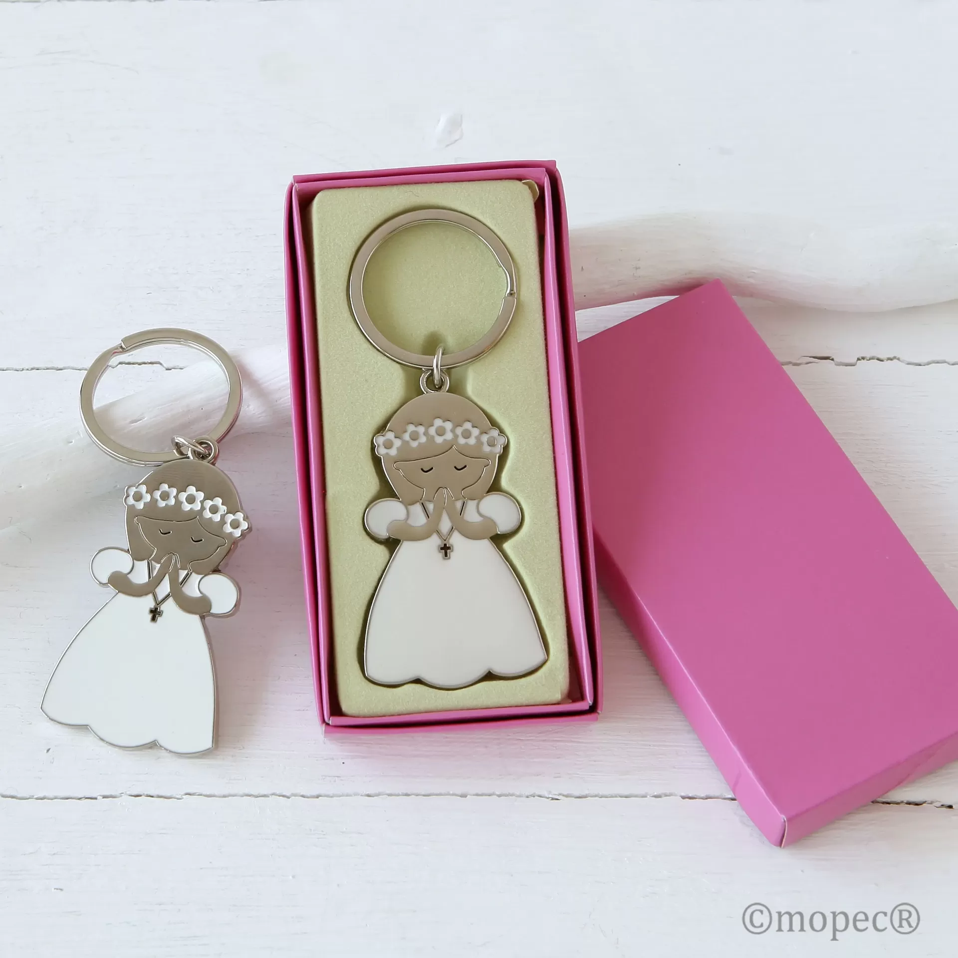 Prático chaveiro de metal brilhante em forma de menina a rezar em um vestido longo pintado de branco.