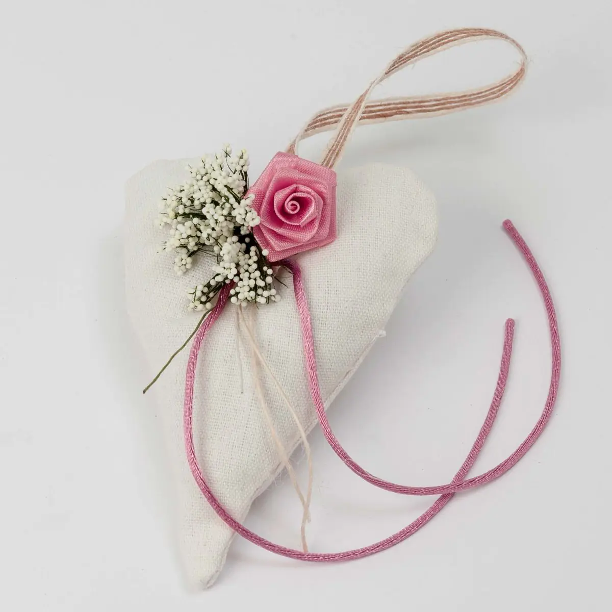 Linda almofada em forma de coração adornada com uma flor, perfeita para amarrar alianças de casamento.