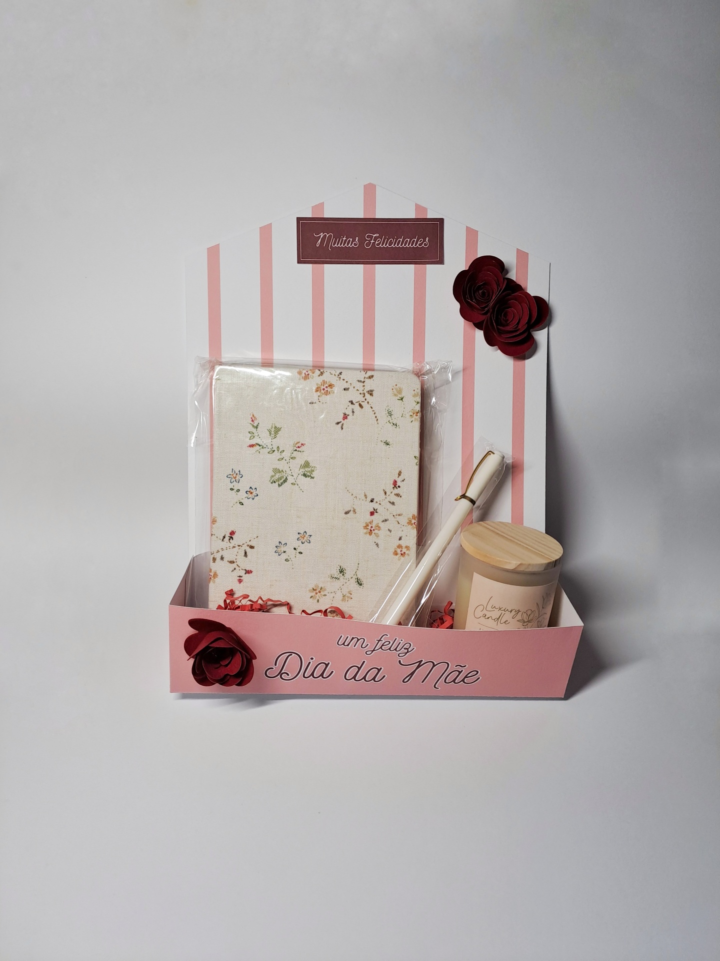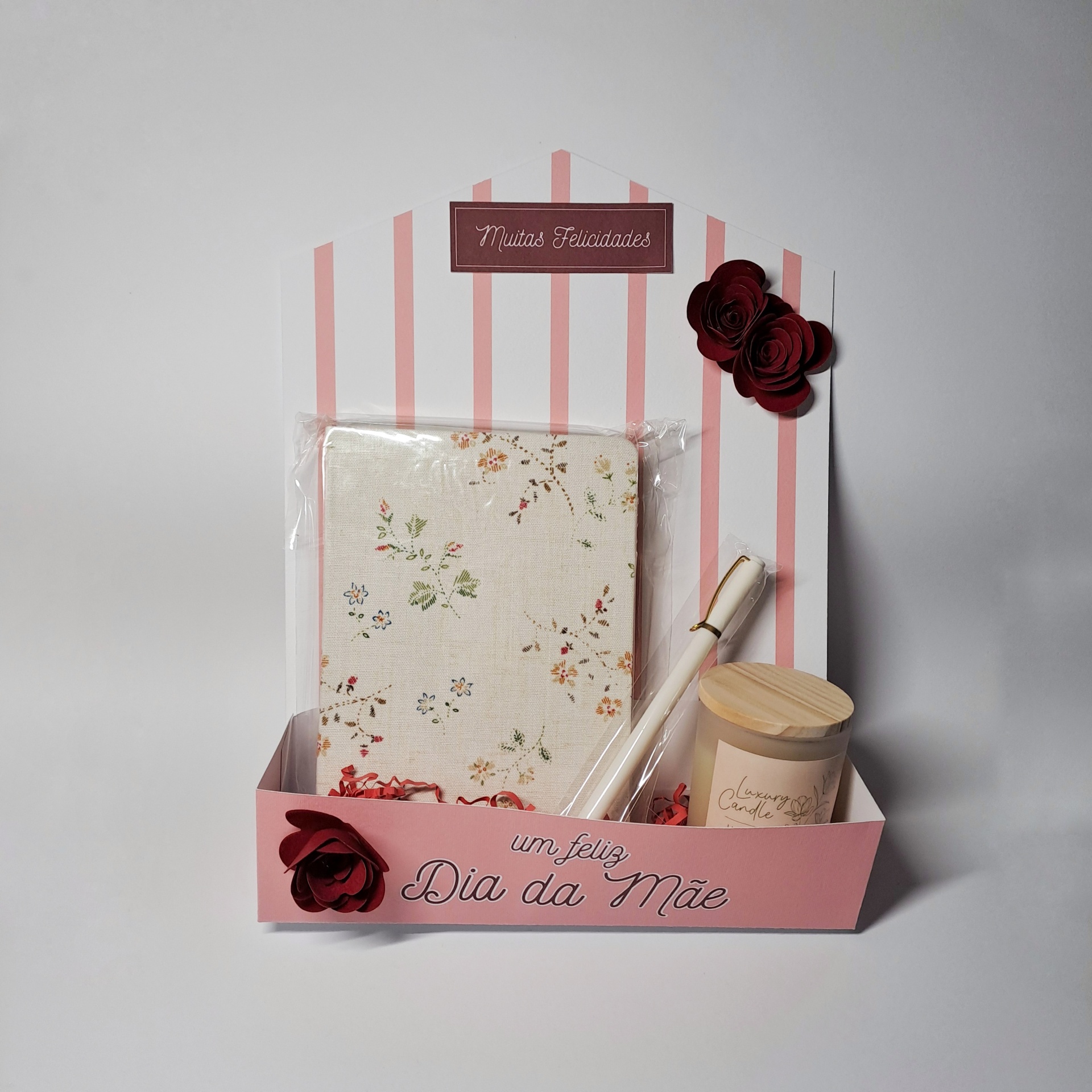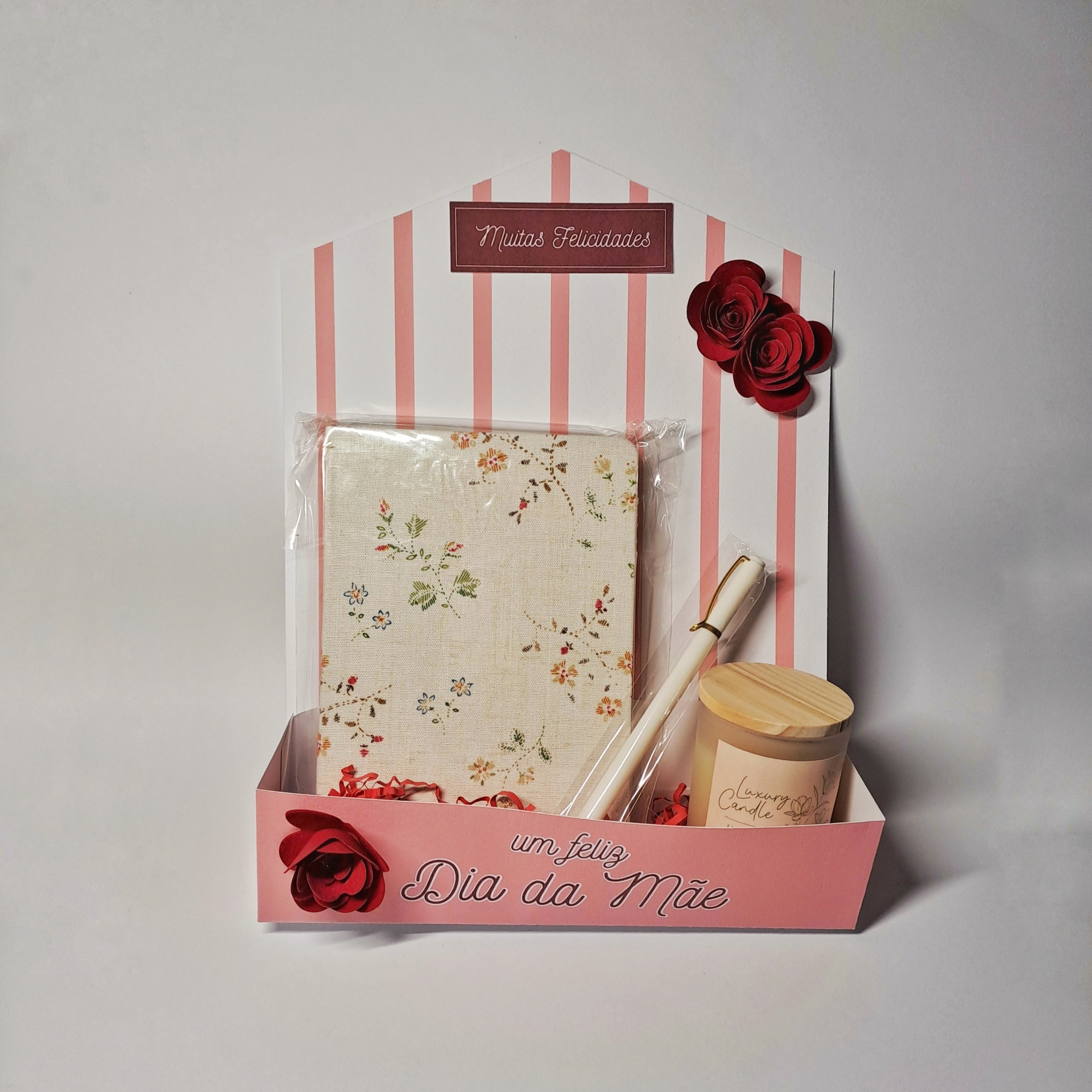 Contém um bloco para apontamentos com vários tipos de paginação (linhas, pautado, kraft e desenho), caneta marcador branco que escreve tom preto e vela perfumada com aroma de Jasmim. decorada com rosas em veludo.