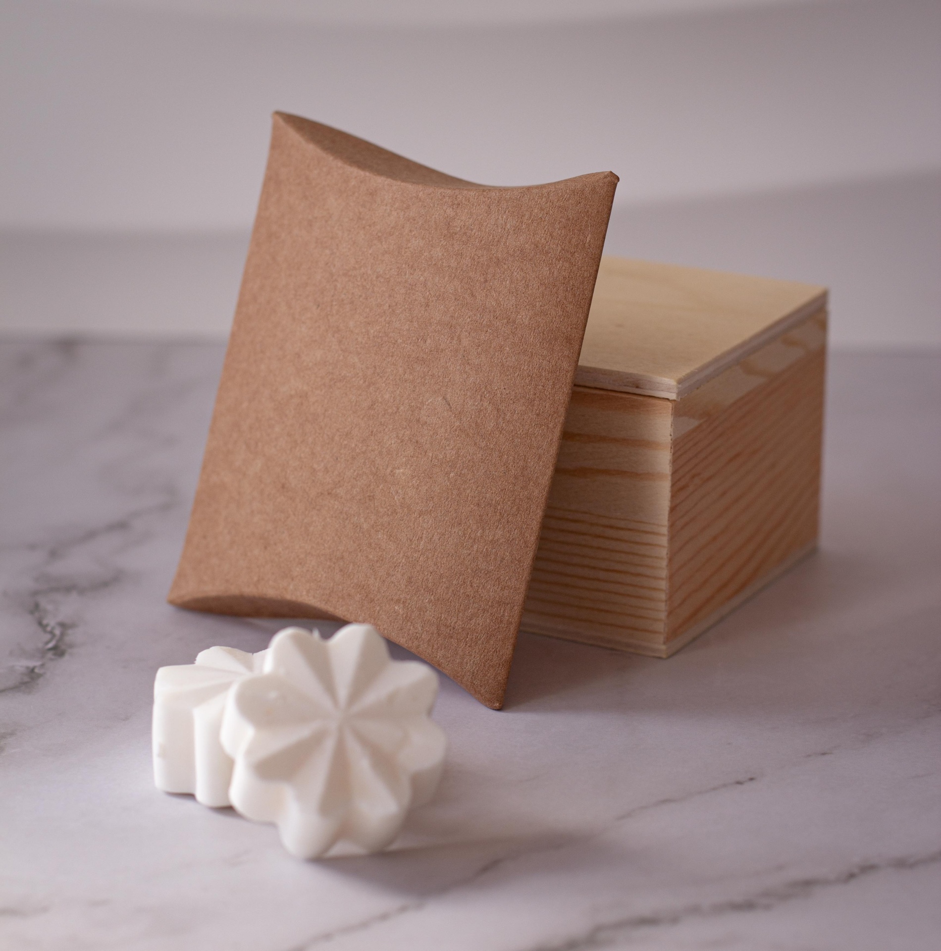Sabonetes brancos em formato de flor com embalagem castanha e caixa de madeira sobre mármore