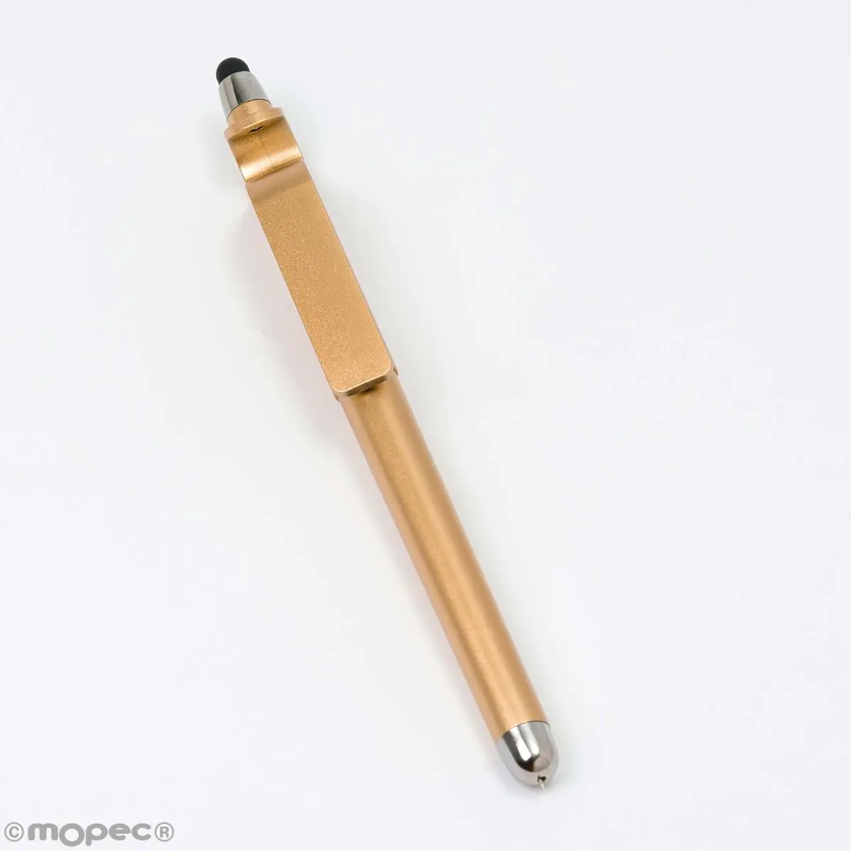 Elegante caneta dourada com ponteiro e suporte para telemóvel.