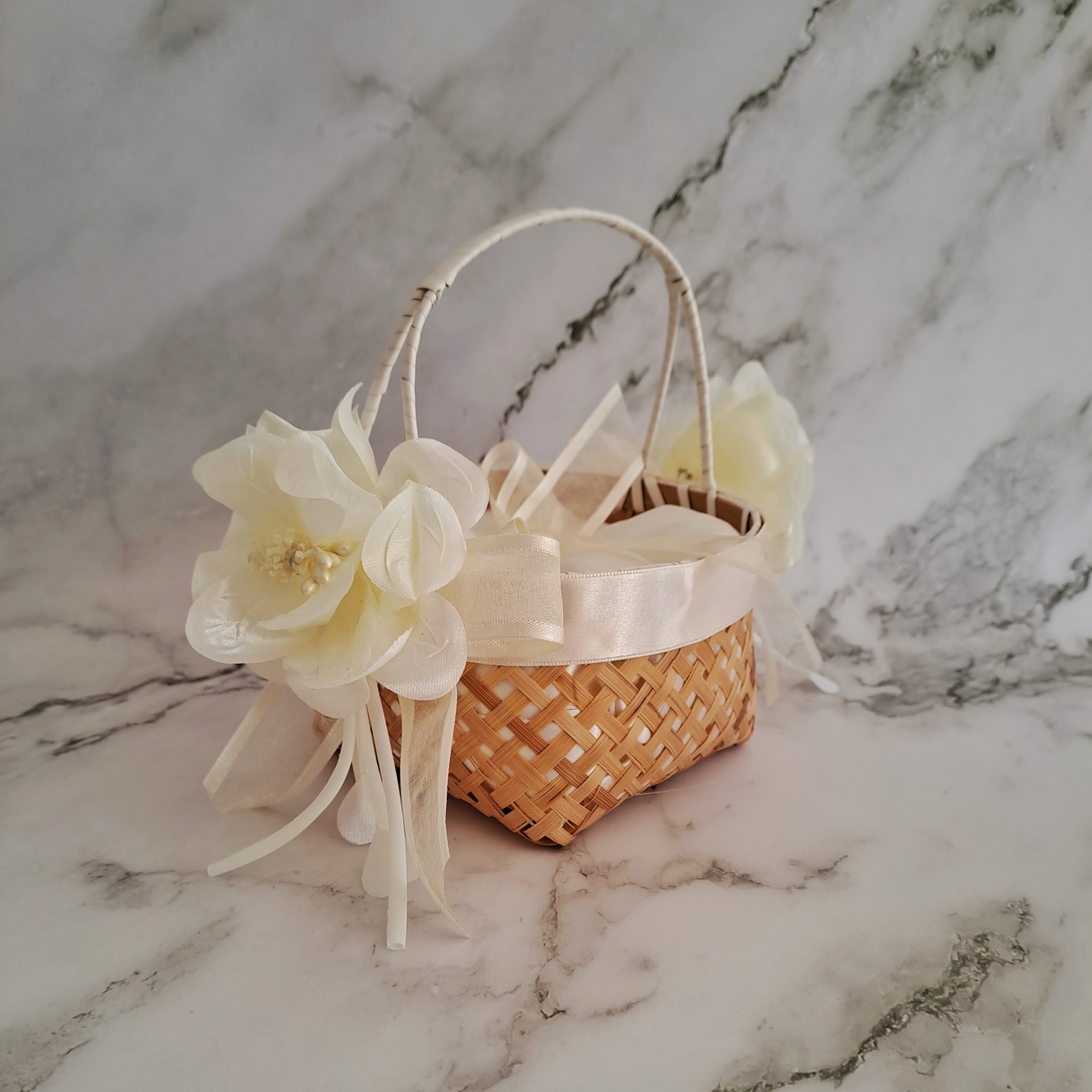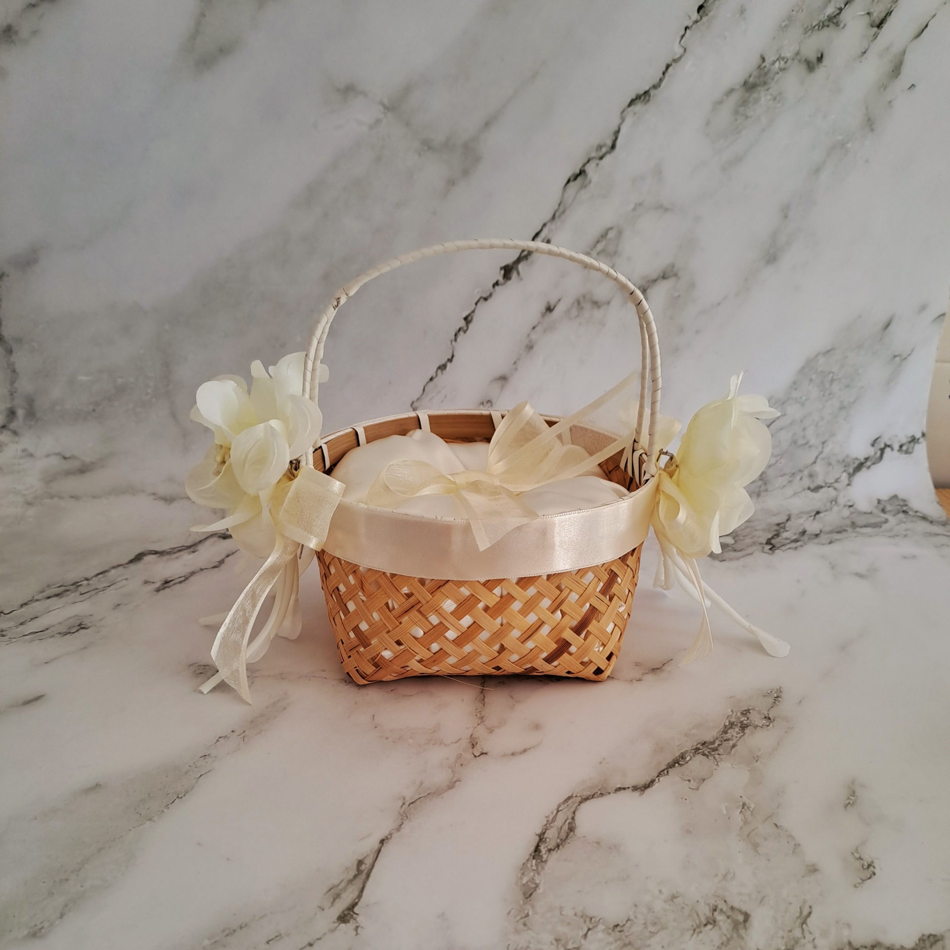 Cesta para Alianças, Pétalas ou Arroz com cetim marfim.