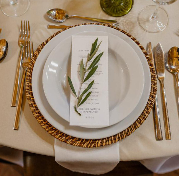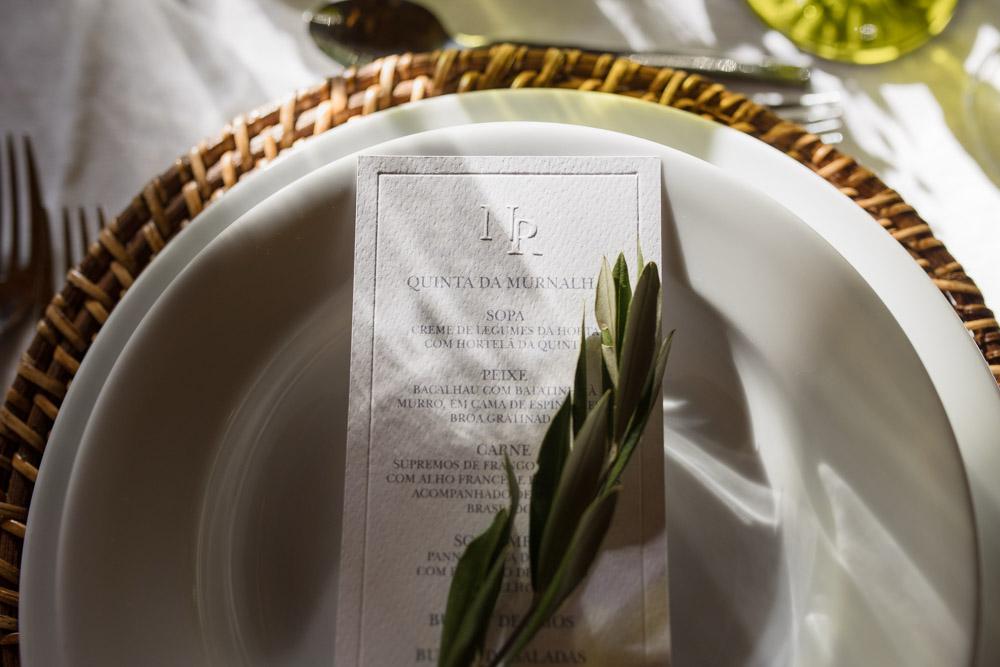 Uma ementa muito simples em branco com impressão a cinza, o monograma e o rebordo em relevo são os detalhes que lhe dão a elegância e marcam toda a diferença,