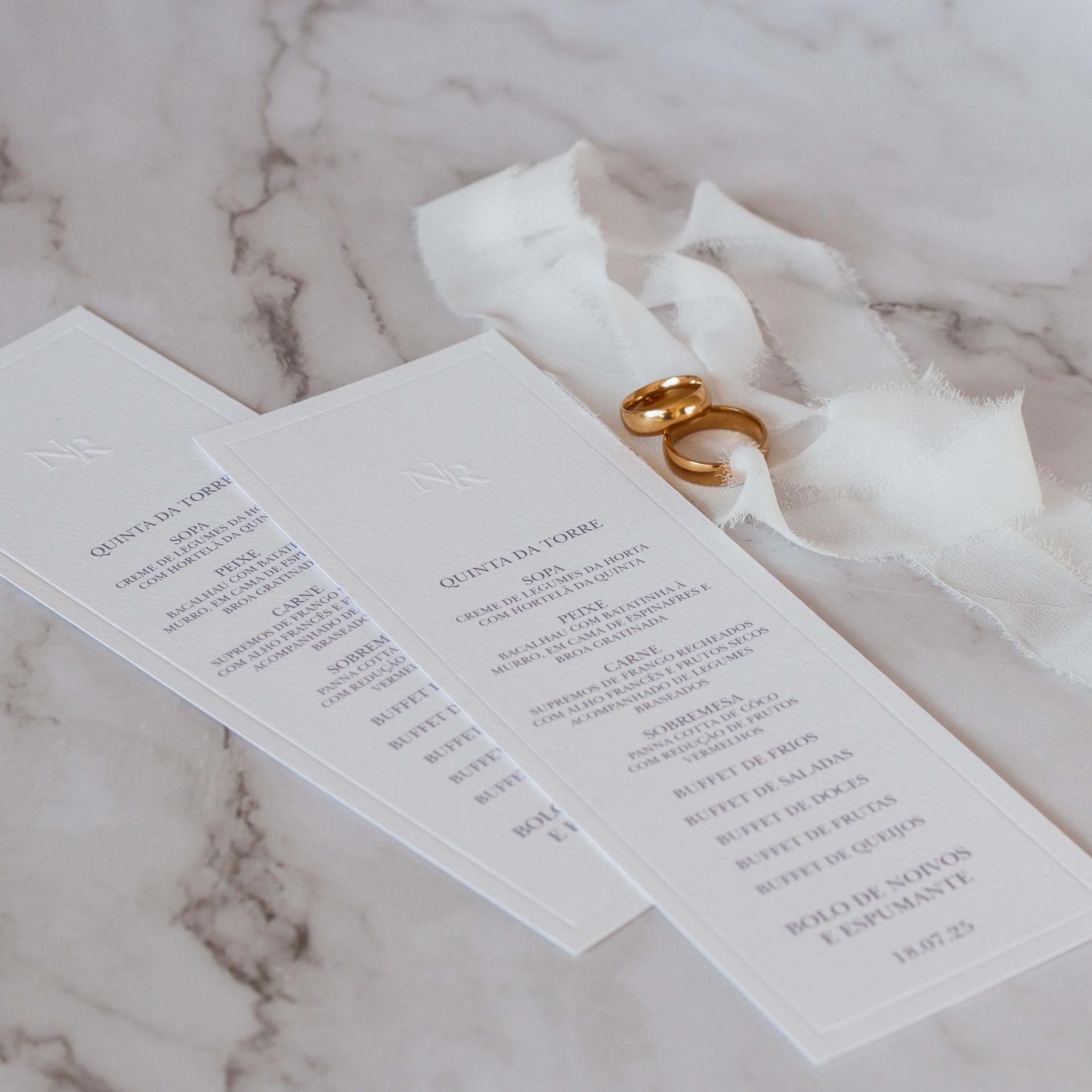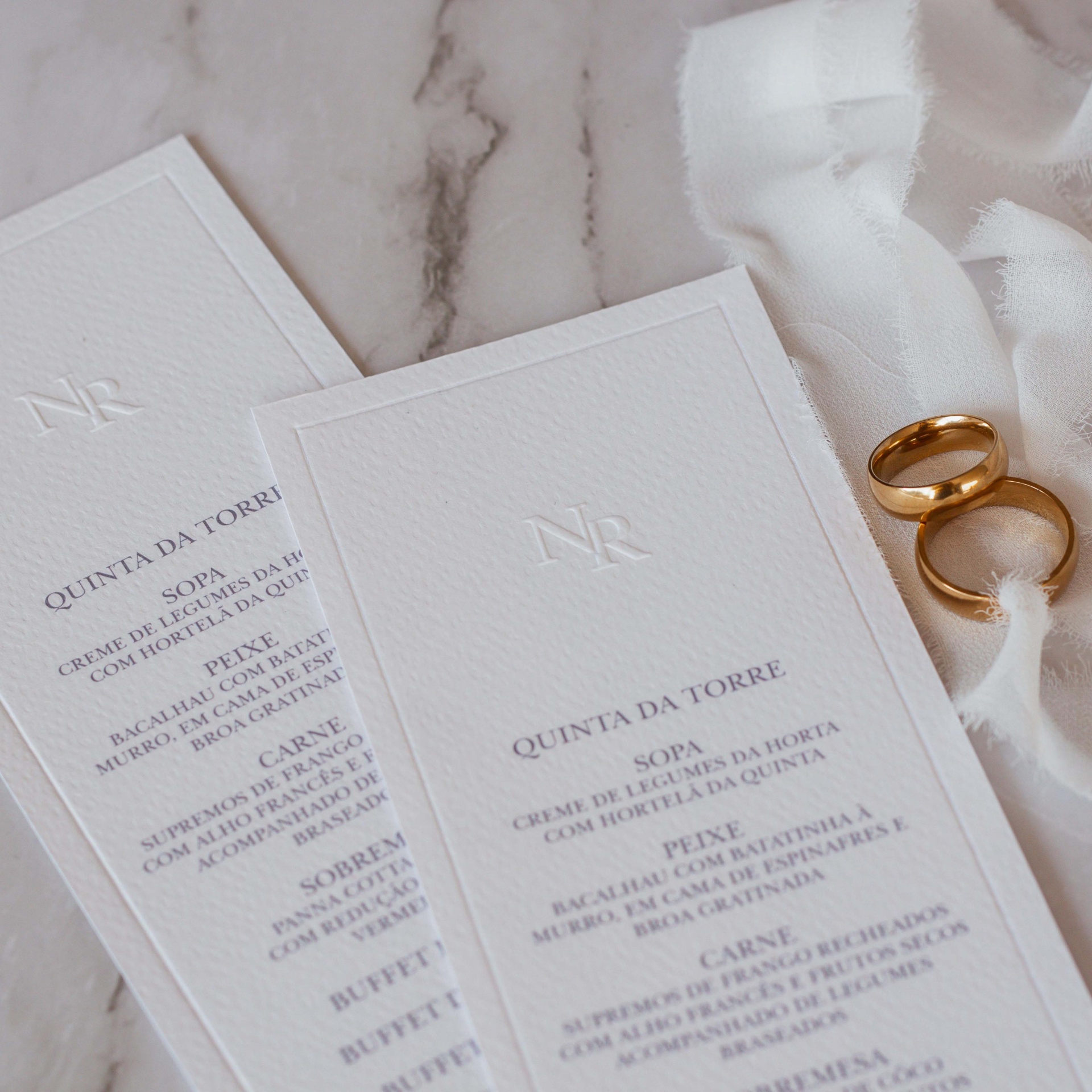 A ementa é impressa em papel prisma branco texturado com aplicação de monograma e rebordo em relevo (valor cobrado á parte).