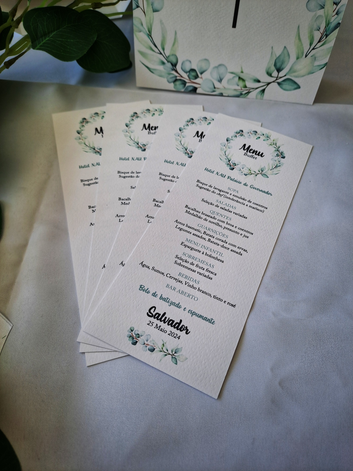 Home Eucalipto Ementa Eucalipto Ementa Eucalipto 0 unidades em stock | SKU: CNJB03EM min_12 Quantidade 12 a 49 50 a 99 Superior a 100 1,08 € Desconto de %. IVA incluído. Compre este produto e ganhe 1 Coração! Saber mais Comprar Contactar Adicionar à wishlist Ementa Eucalipto impressa em papel texturado branco 220gr. Formato: 8x20cm Coloque os dados necessários como nomes, descrição da ementa, data, local da cerimónia no campo das observações no final da encomenda. NOTA: Uma prova será feita e enviada via email ou whatsapp para sua aprovação prévia. Marca Paperworks Tags aniversáriosfestasCasamentoCriançascolorido Características Partilhar