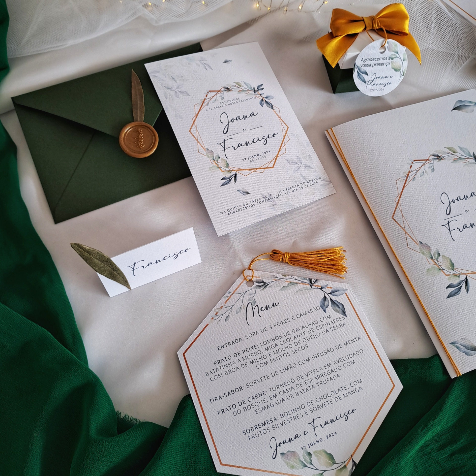Home Oliveira Ementa Oliveira Ementa Oliveira 0 unidades em stock | SKU: CNJ01EM min_25 Quantidade 25 a 49 50 a 99 superior a 100 Berloque/Tassel dourado Sem berloque Com berloque 1,15 € Desconto de %. IVA incluído. Compre este produto e ganhe 1 Coração! Saber mais Comprar Contactar Adicionar à wishlist Ementa Oliveira Formato hexagonal impresso em LR Bianco. Opção de berloque/tassel dourado com cerca de 6cm. Coloque os dados necessários como nomes, data e descrição da ementa no campo das observações no final da encomenda. NOTA: Uma prova será feita e enviada via email ou whatsapp para sua aprovação prévia. Marca Paperworks Tags VerdeOliveiraFolhaBerloqueTassel Características Partilhar