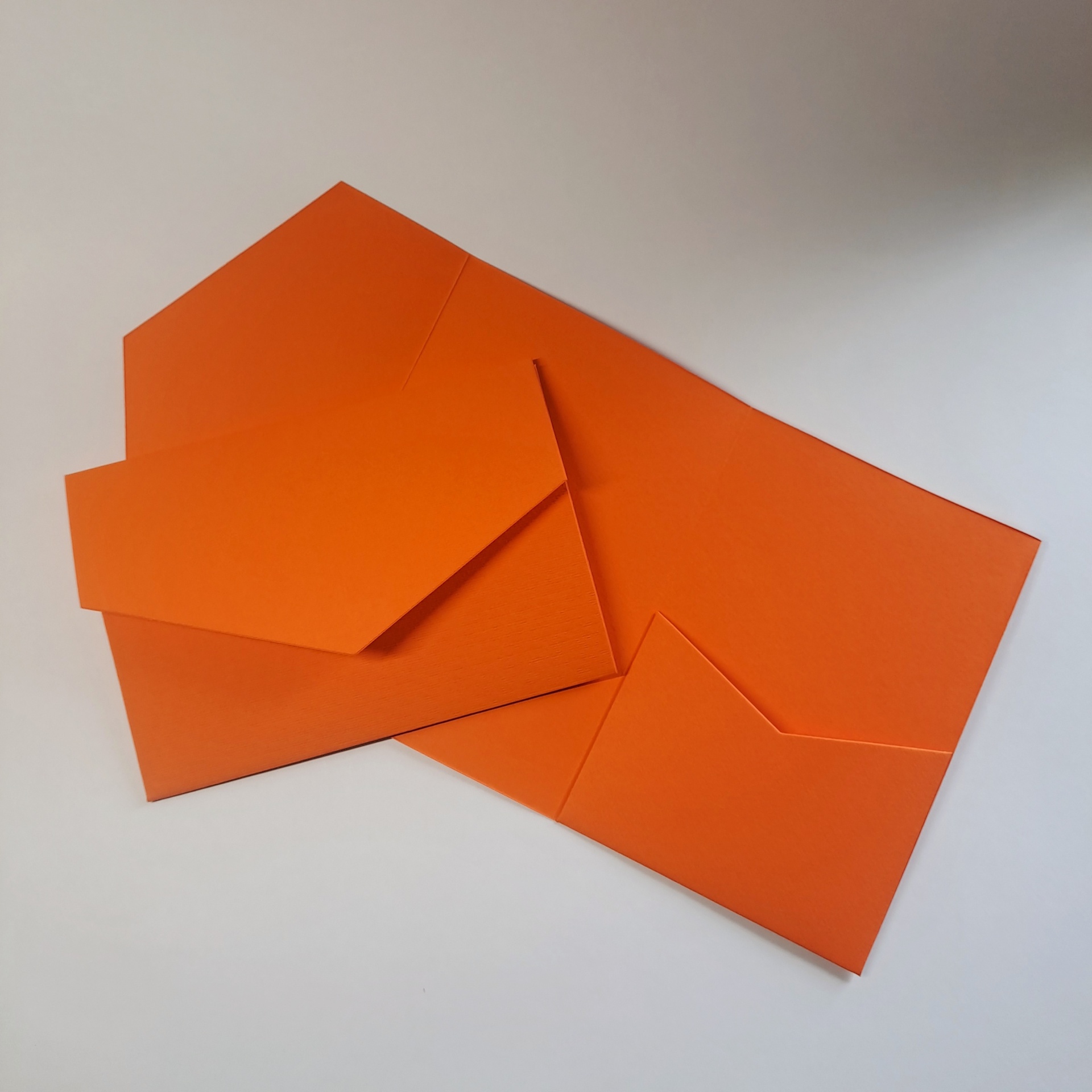 Envelope em cartolina LR mate/texturada com pala em bico, desdobrável com bolsa interior.