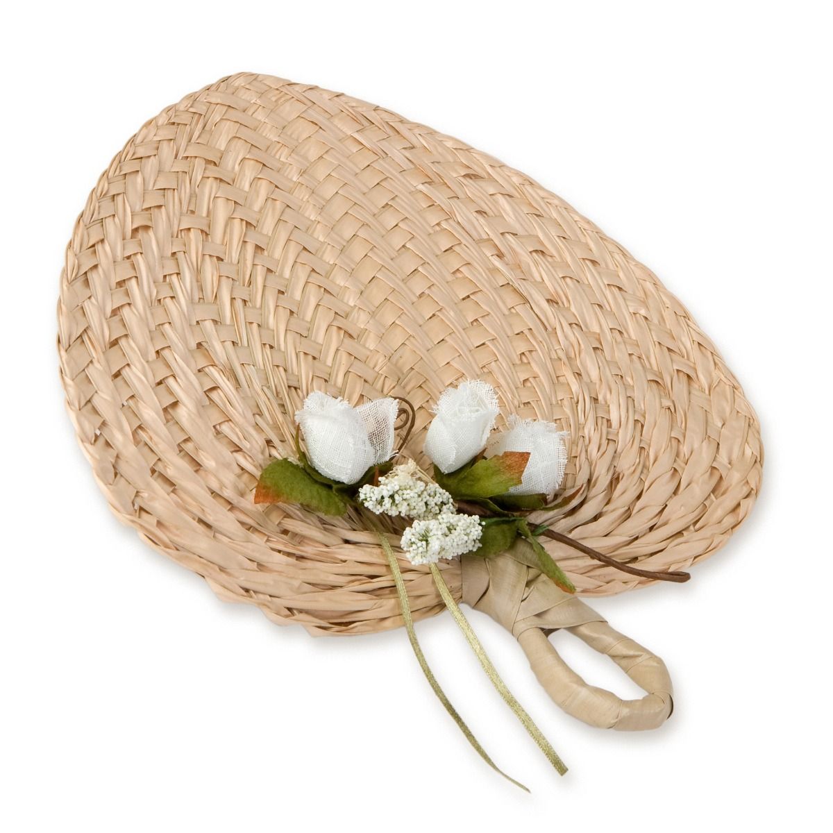 Leque de palhinha decorado em folha de palmeira bege para presentear os convidados do casamento.
