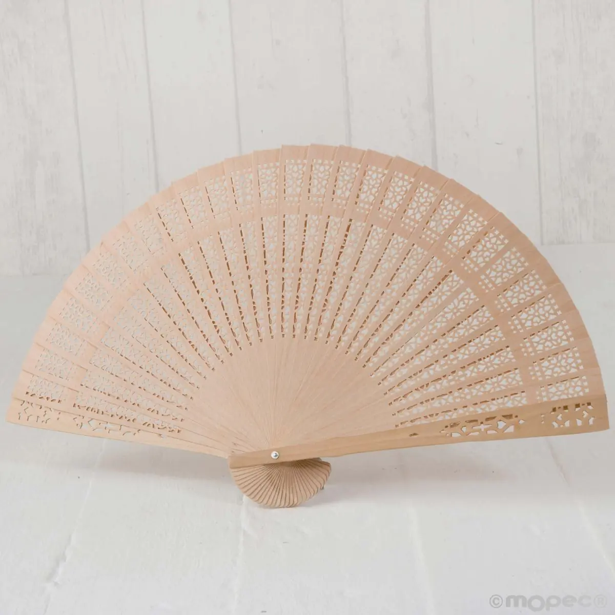 6 unidades de lindos leques de madeira em cor natural com varetas recortadas criando um mosaico de flores.