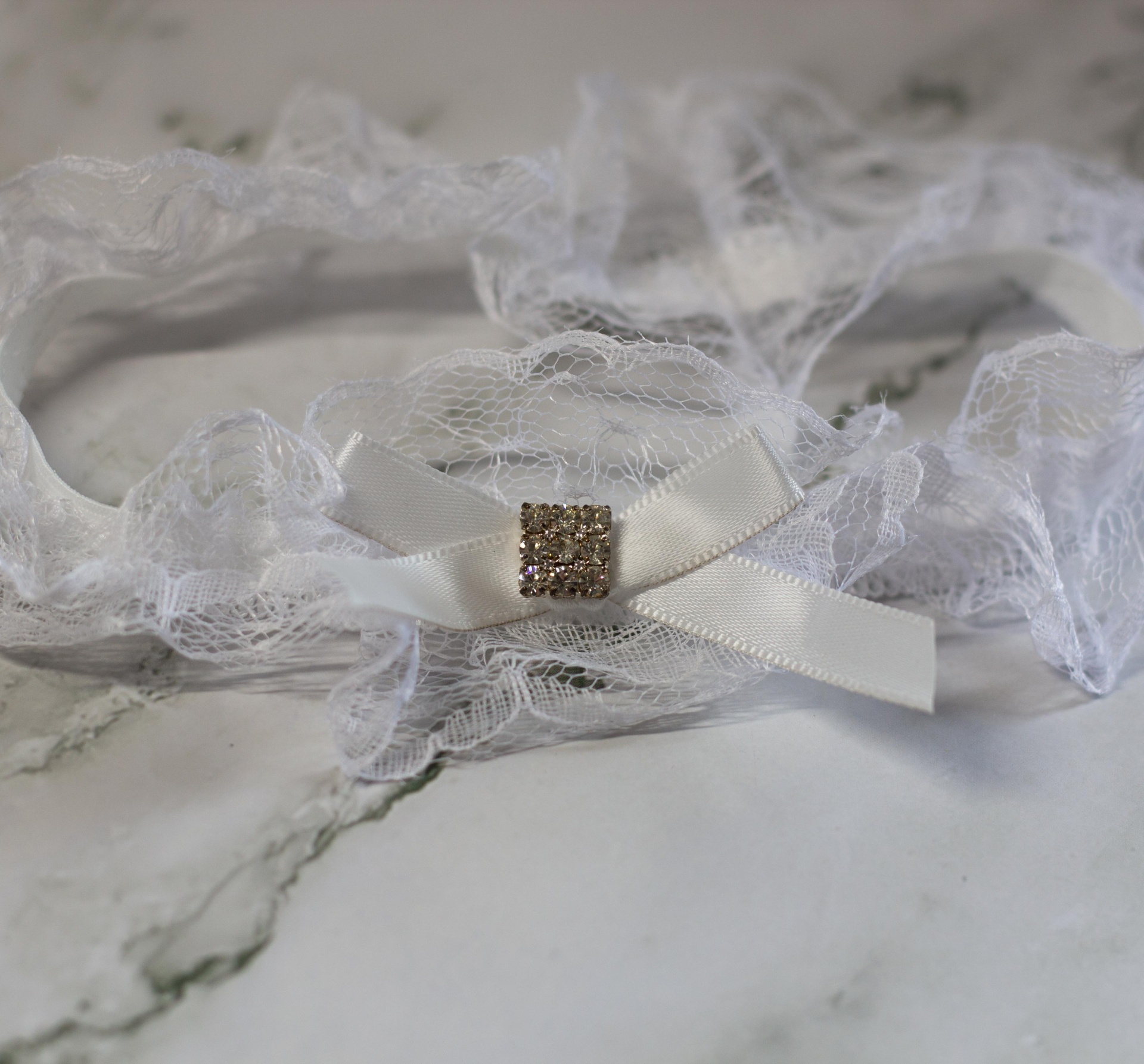 Liga para Noiva com renda branca e strass de formato quadrado.