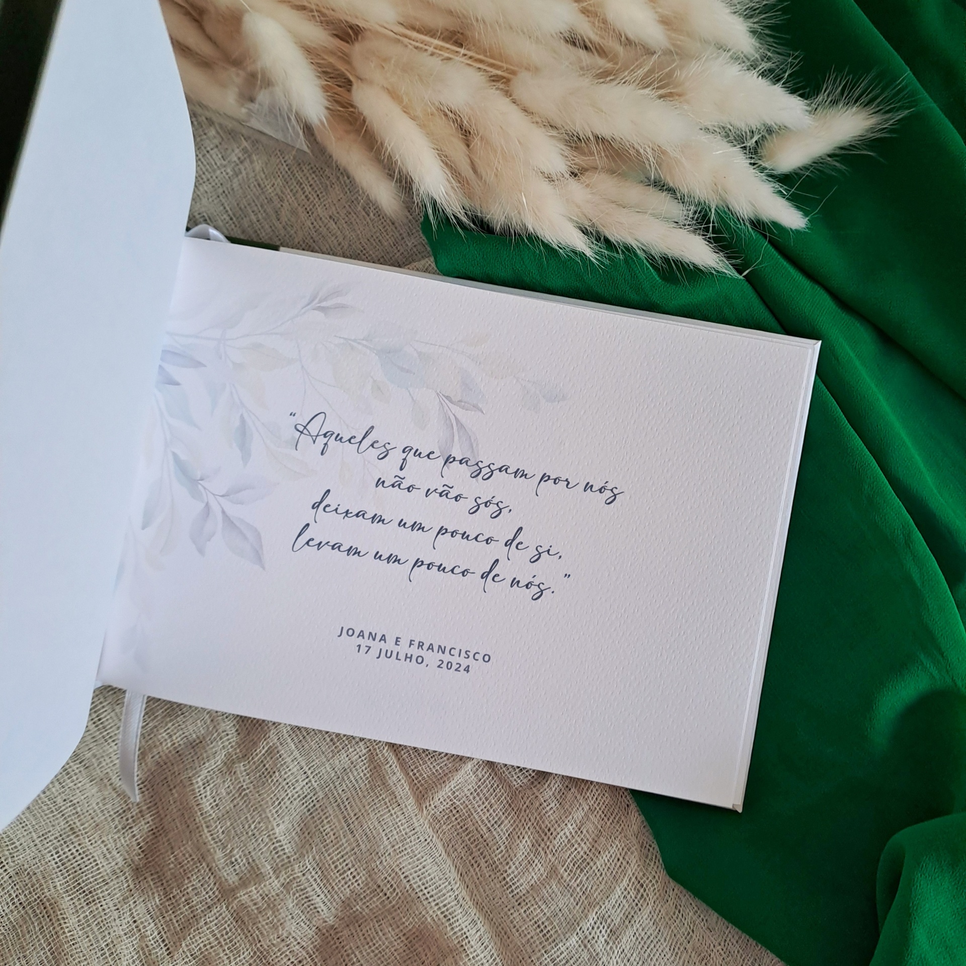 Livro de Honra A5 ou A4 (ao baixo) com capa rígida personalizável, com página de introdução com mensagem aos seus convidados e a restante paginação com uma pequena personalização com monograma.