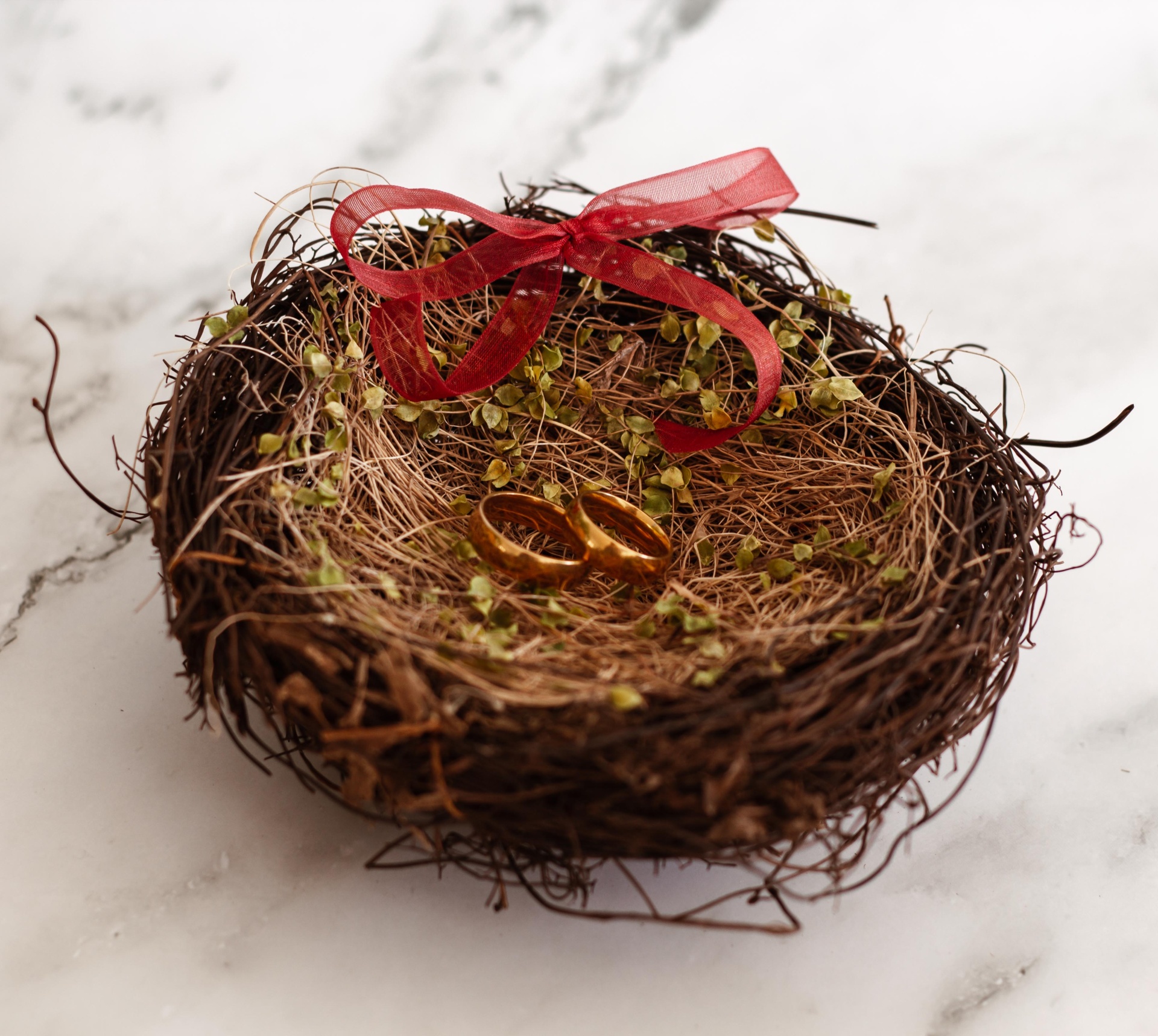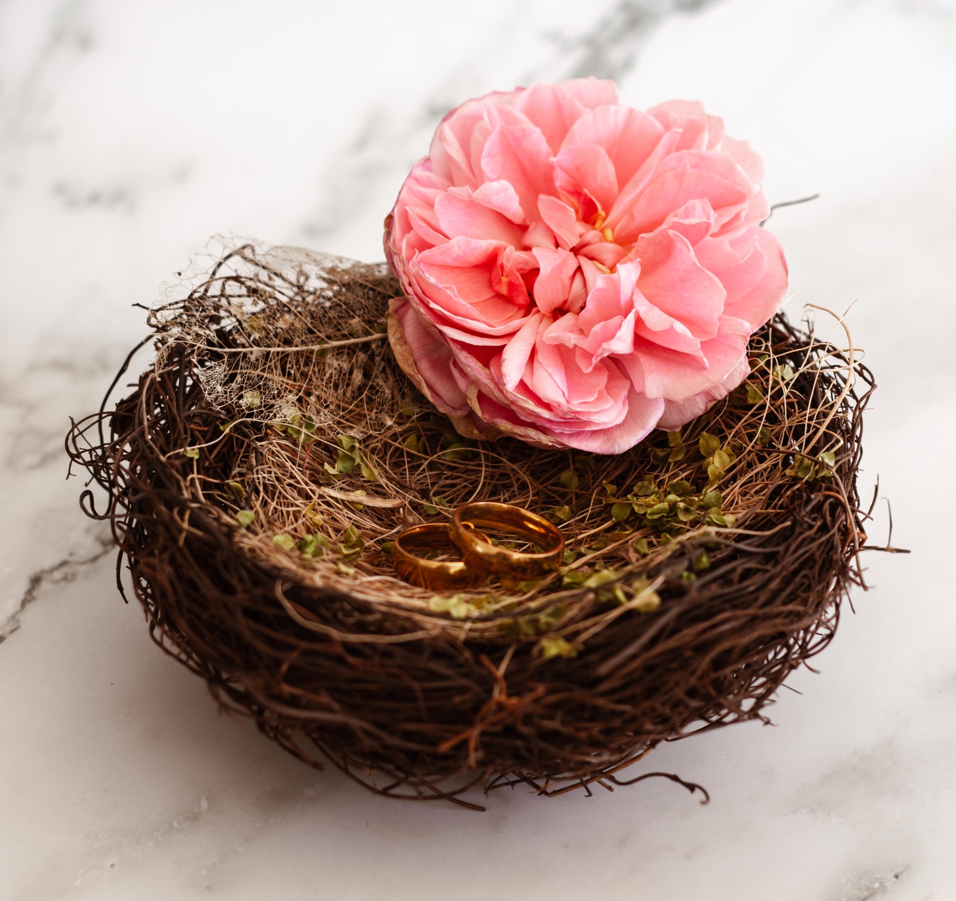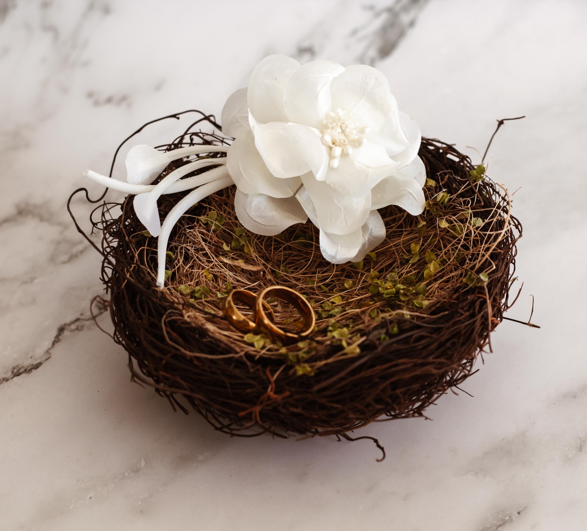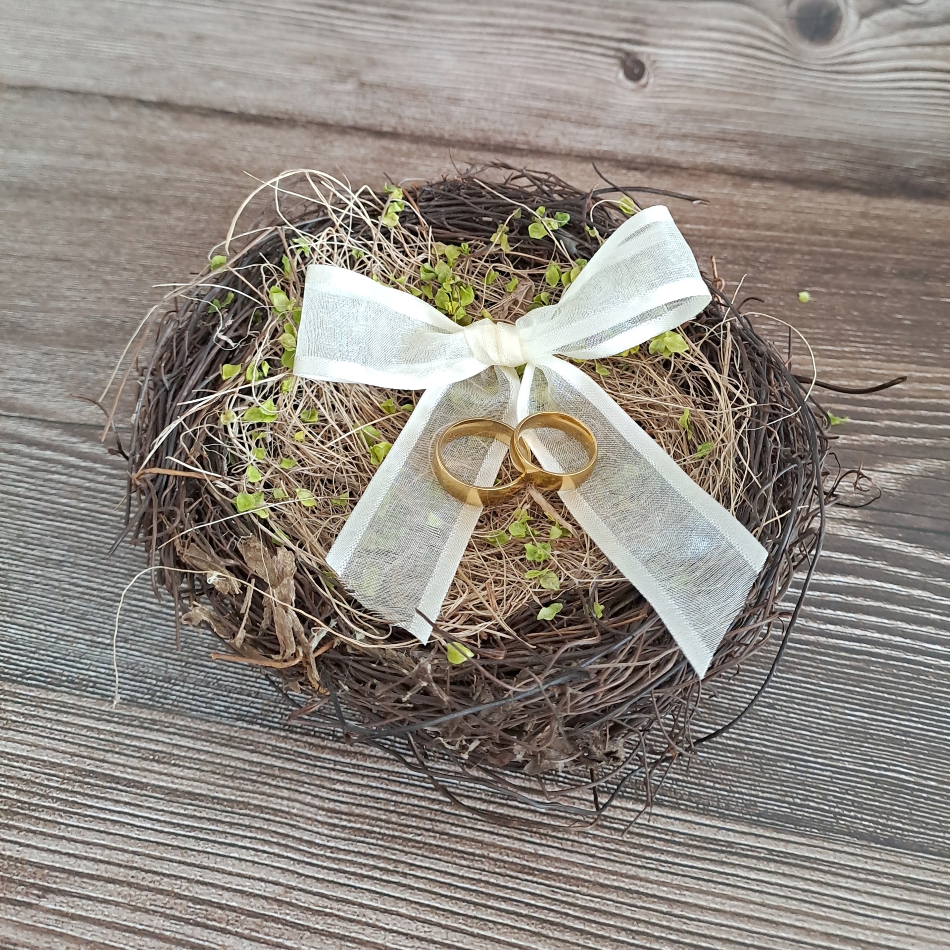 Este ninho, feito à base de fibrase ramagem totalmente naturais é a mais perfeita base para as suas alianças de casamento.