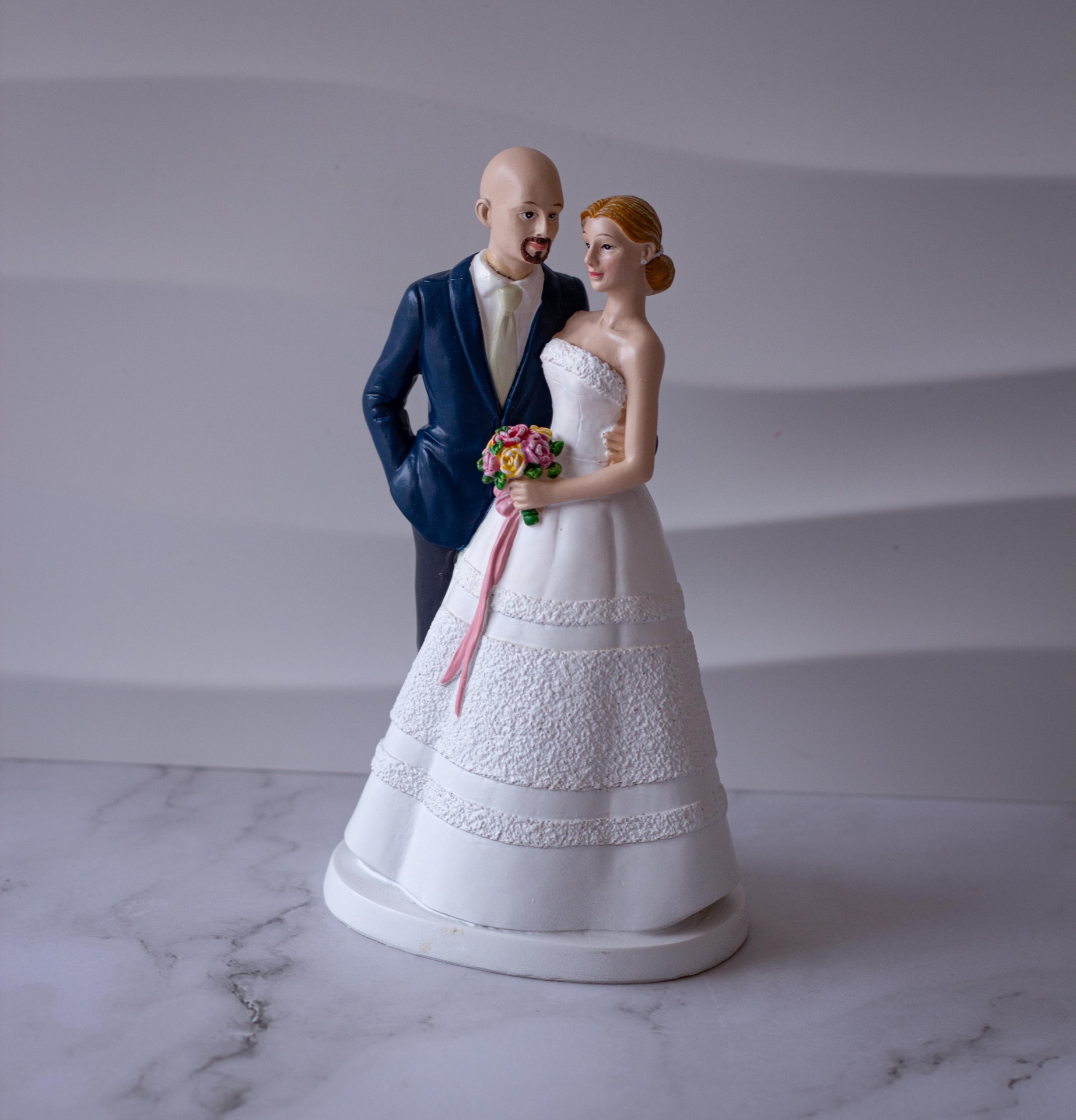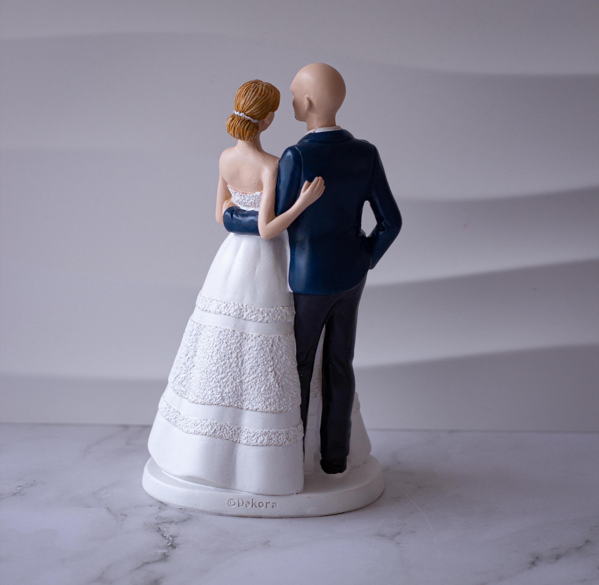 Topo de Bolo noivos clássicos, a Noiva tem o cabelo apanhado e o Noivo não tem cabelo.