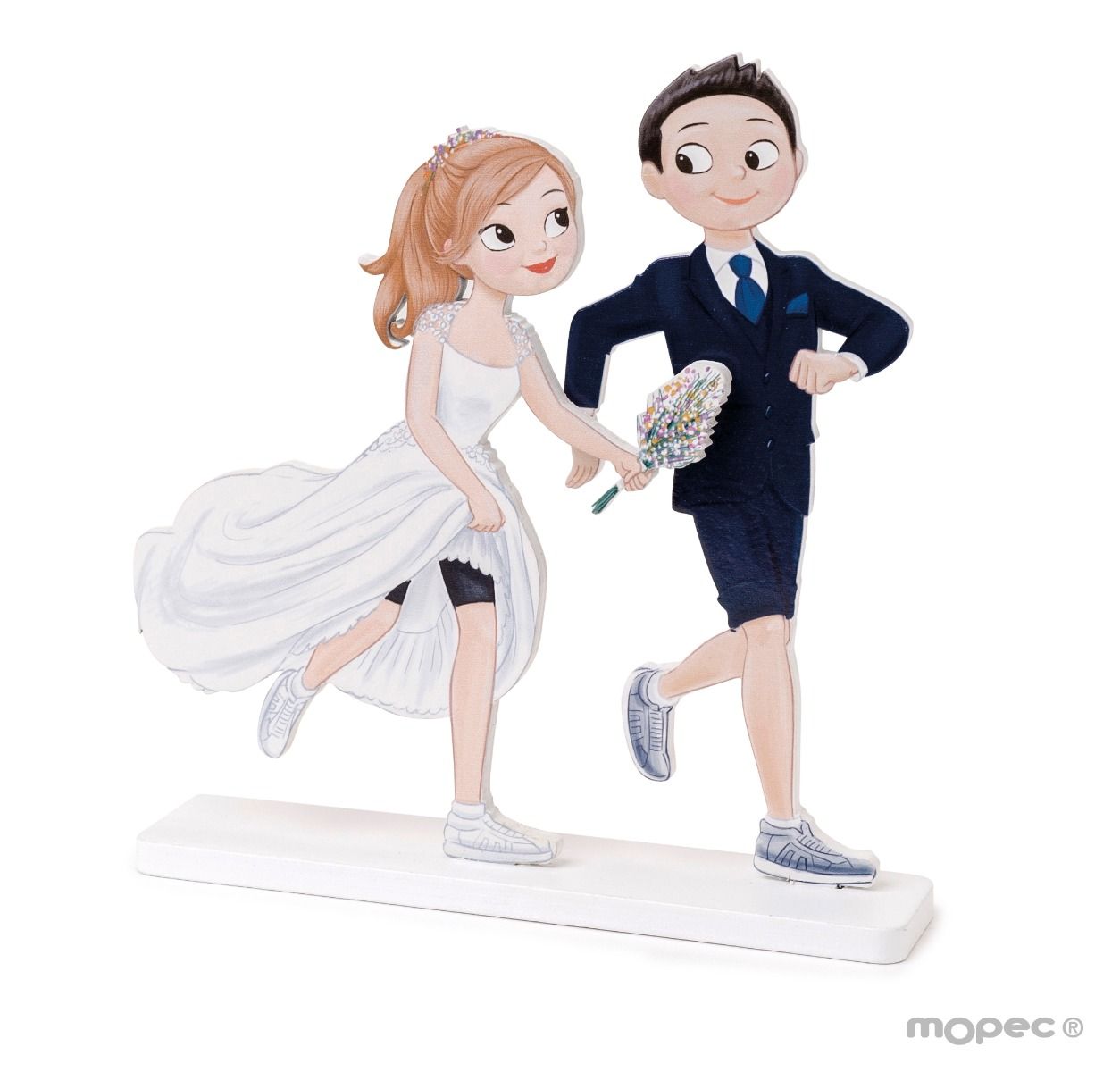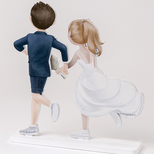 Topo de Bolo Noivos, divertido e original boneco de madeira especialmente desenhado para casais que praticam corrida, com a imagem do casal vestido de noivos mas com sapatos e calças desportivas.