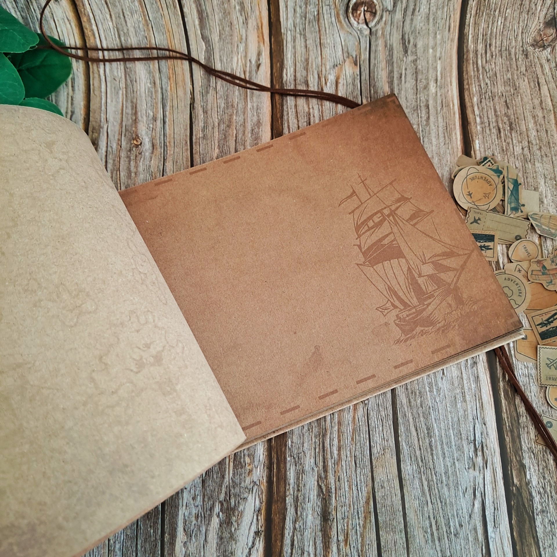 É um livro em formato A4 com folhas em kraft impressas com vários motivos como barcos, bússulas e mapas antigos. Fecha com cordas de camurça para dar ainda mais um look antigo.
