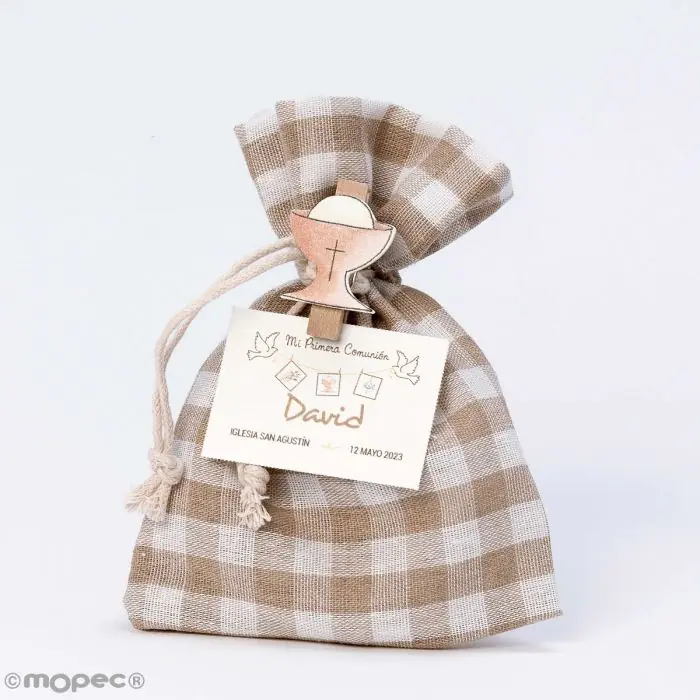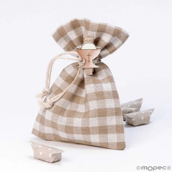 Bolsa de xadrez bege e marfim 10x14cm. com fecho de corda e mola com um cálice.