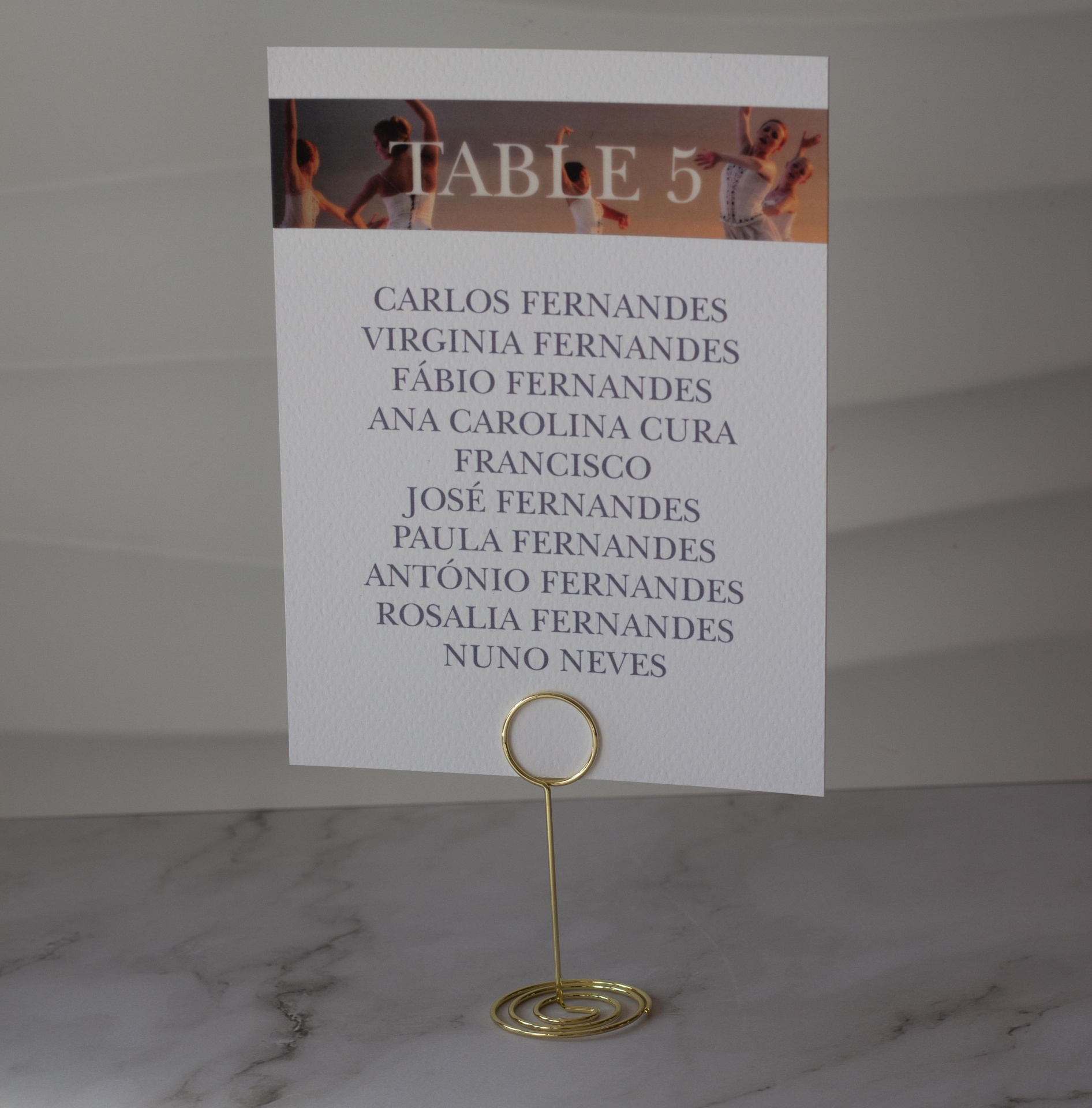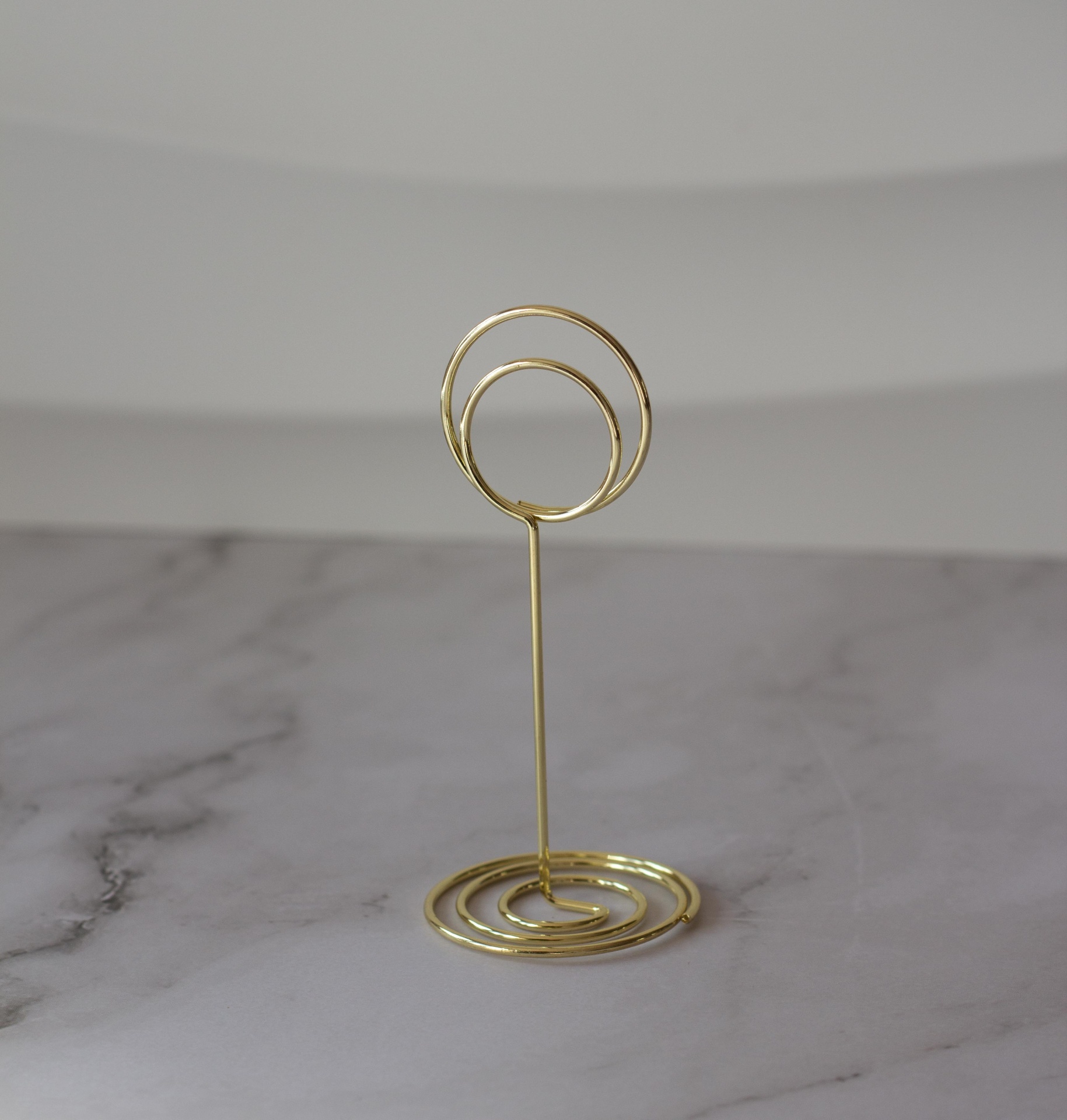 Elegante suporte de metal dourado, em forma de espiral, que serve de clip/suporte para os marcadores de mesa ou outros tipos de identificadores.